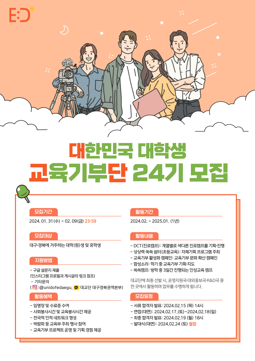 📣 [대교단] 대한민국 대학생 교육기부단 대구경북권역본부 24기를 모집합니다! 📣