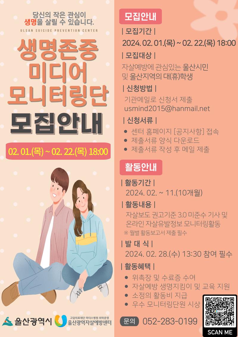 울산광역자살예방센터에서는 2024년 생명존중 미디어 모니터링단을 아래와 같이 모집하고자 합니다. 자살예방에 관심있으신 분들의 많은 참여 부탁드립니다. 여러분들의 작은 관심이 소중한 생명을 살릴 수 있습니다.