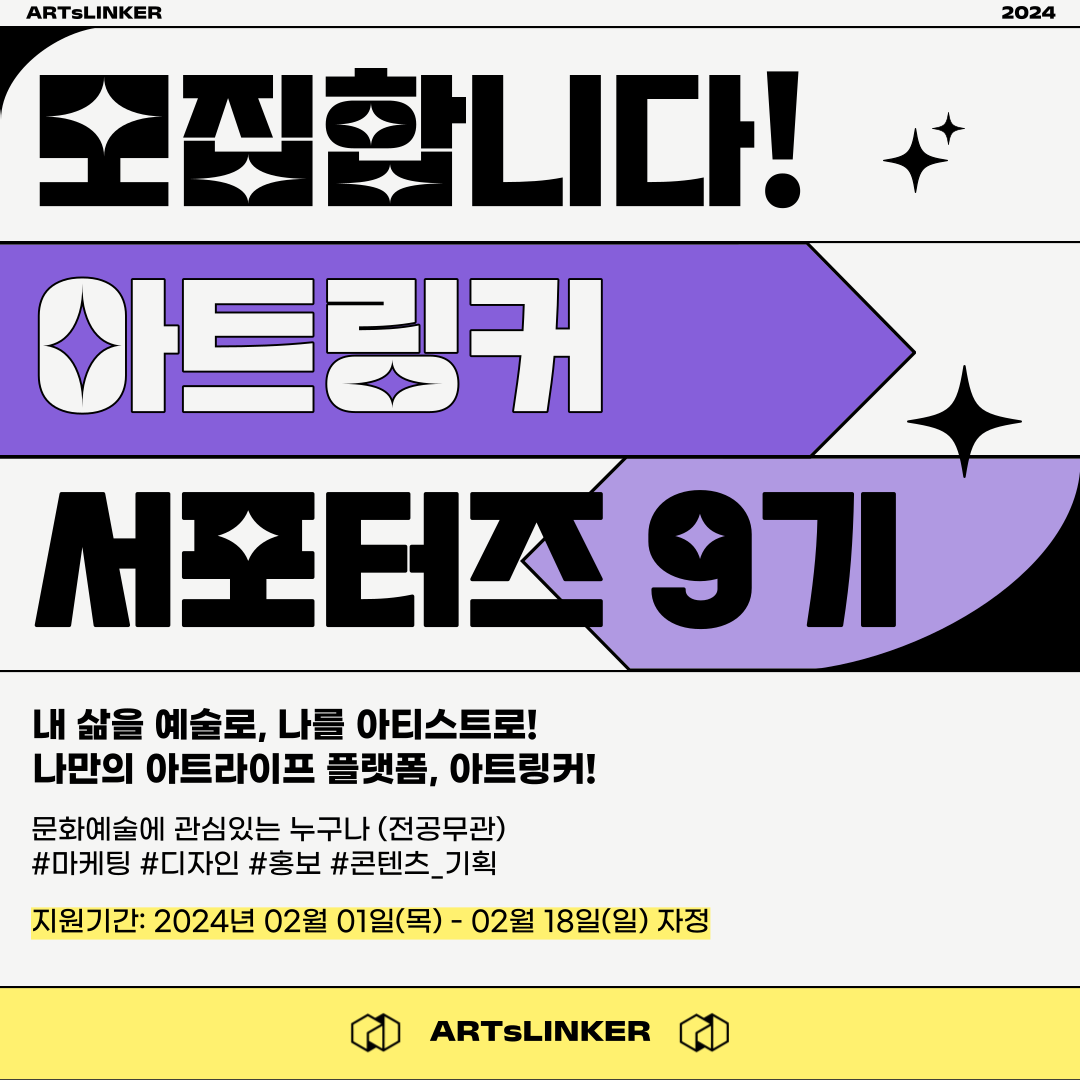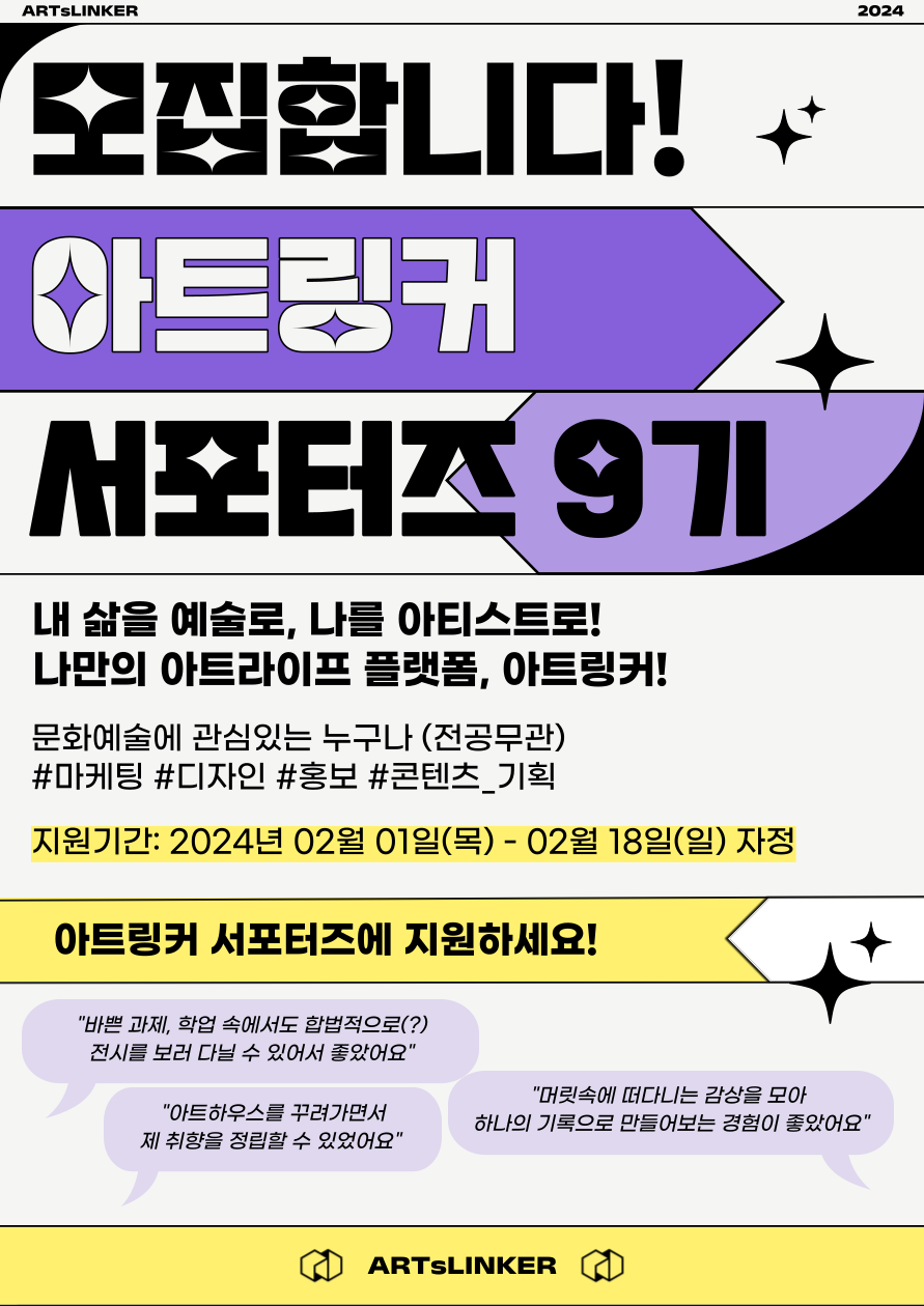 내 취향의 아티스트를 덕질해본 경험, 영화나 뮤지컬의 티겟을 모아본 경험, 좋아하는 전시회에서 사진을 남겨본 경험, 책을 읽고 감상을 글로 남겨본 경험이 있으신가요? 여러분들이 좋아하는 예술을 기반으로, 여러분들만의 개성있는 콘텐츠를 제작해볼 수 있는 절호의 찬스. 아트링커 서포터즈에 지원하세요!