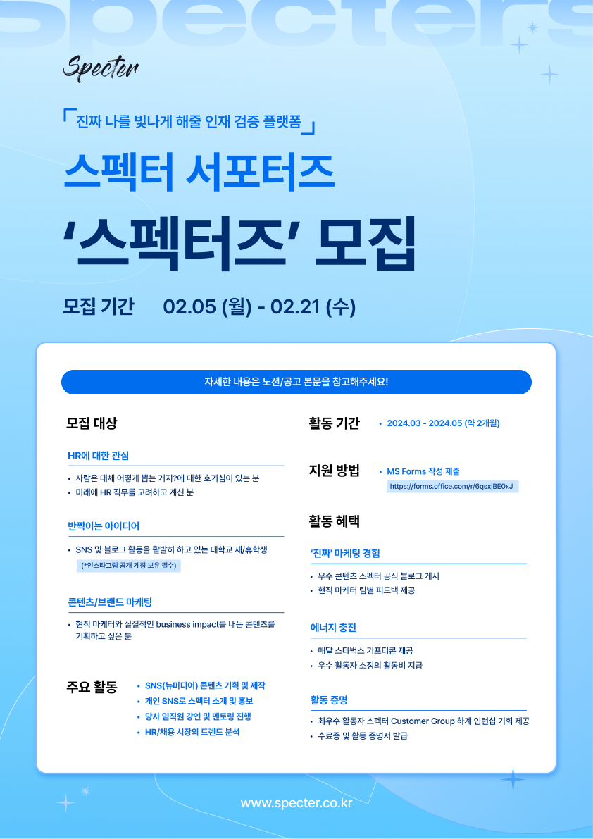 매력적인 이력서를 만들기 위한 단 하나의 대외활동 "스펙터즈"에 지금 바로 지원하세요!