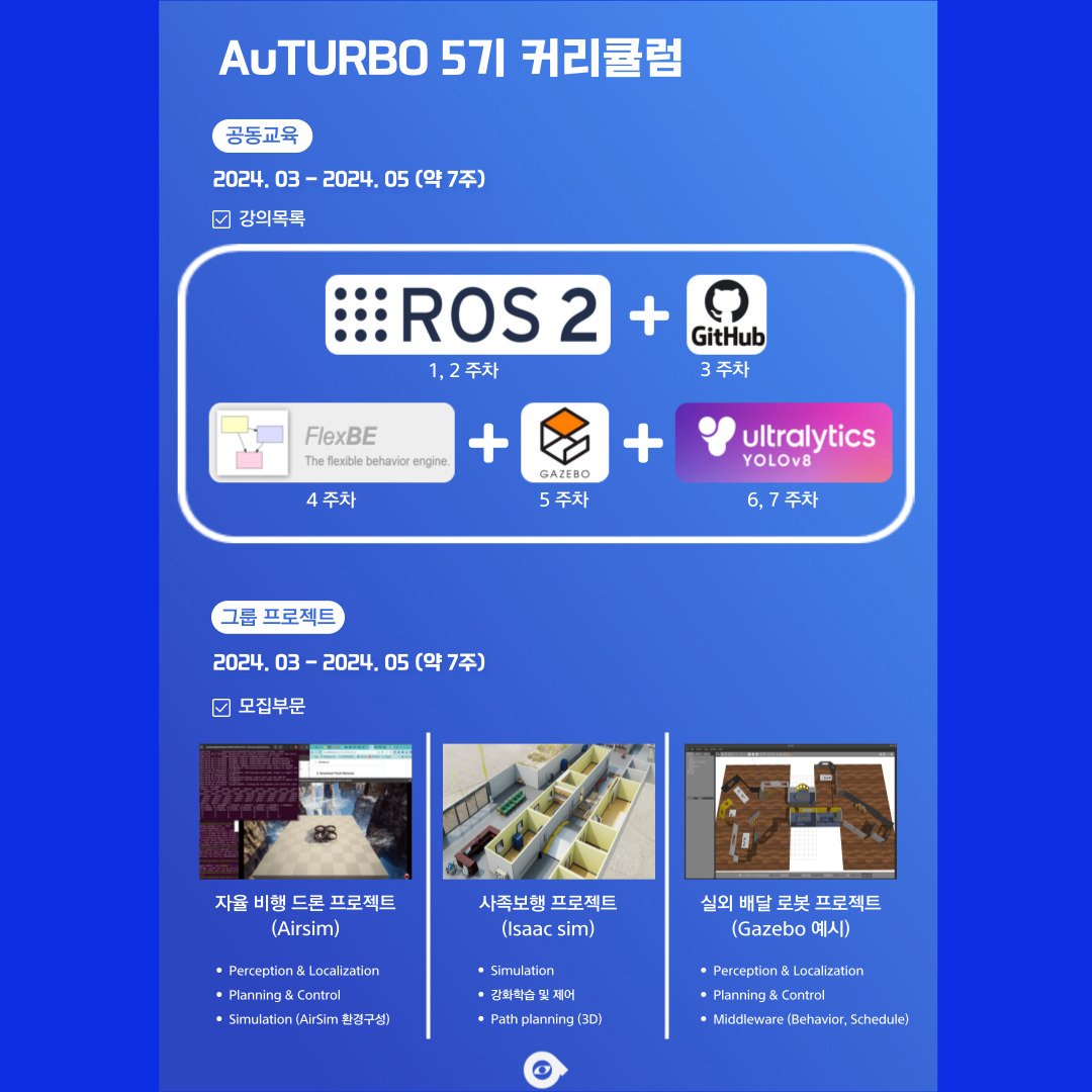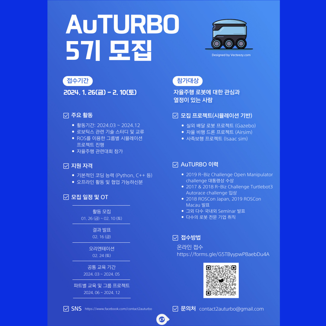 AuTURBO는 자율주행 로봇 개발에 열정을 가진 사회인들의 모임입니다.