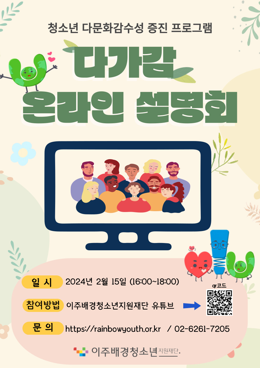 본 프로그램은 이주배경청소년지원재단에서 초등, 중등을 위해 개발한 인식개선 프로그램입니다. 다가감 프로그램을 홍보하기 위해 처음으로 온라인 설명회를 진행할 예정입니다. 많은 관심과 참여 부탁드립니다.
