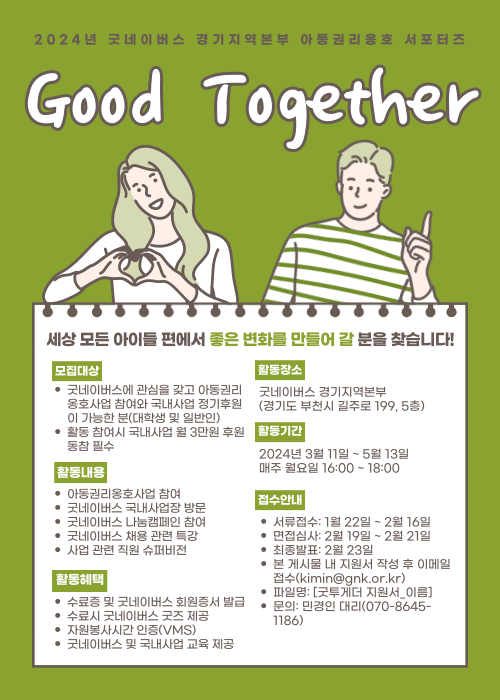 - 굿네이버스에 관심을 갖고 아동권리옹호사업 참여와 국내사업 정기후원이 가능한 분(대학생 및 일반인)