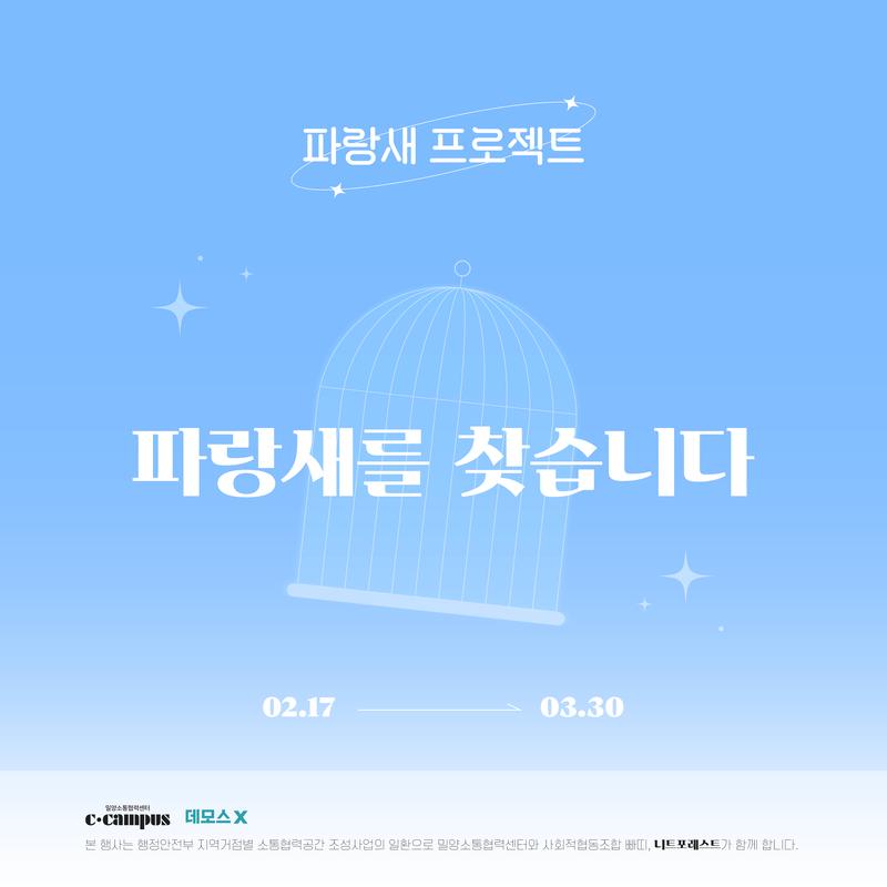 퇴사, 취업 준비 등 다양한 이유로 무업상태인 경남권 청년(파랑새)들이 온/오프라인 프로그램을 통해 자신의 가치를 발견하고, 느슨한 연결과 소속감을 느끼며 함께 성장하는 커뮤니티 활동입니다.