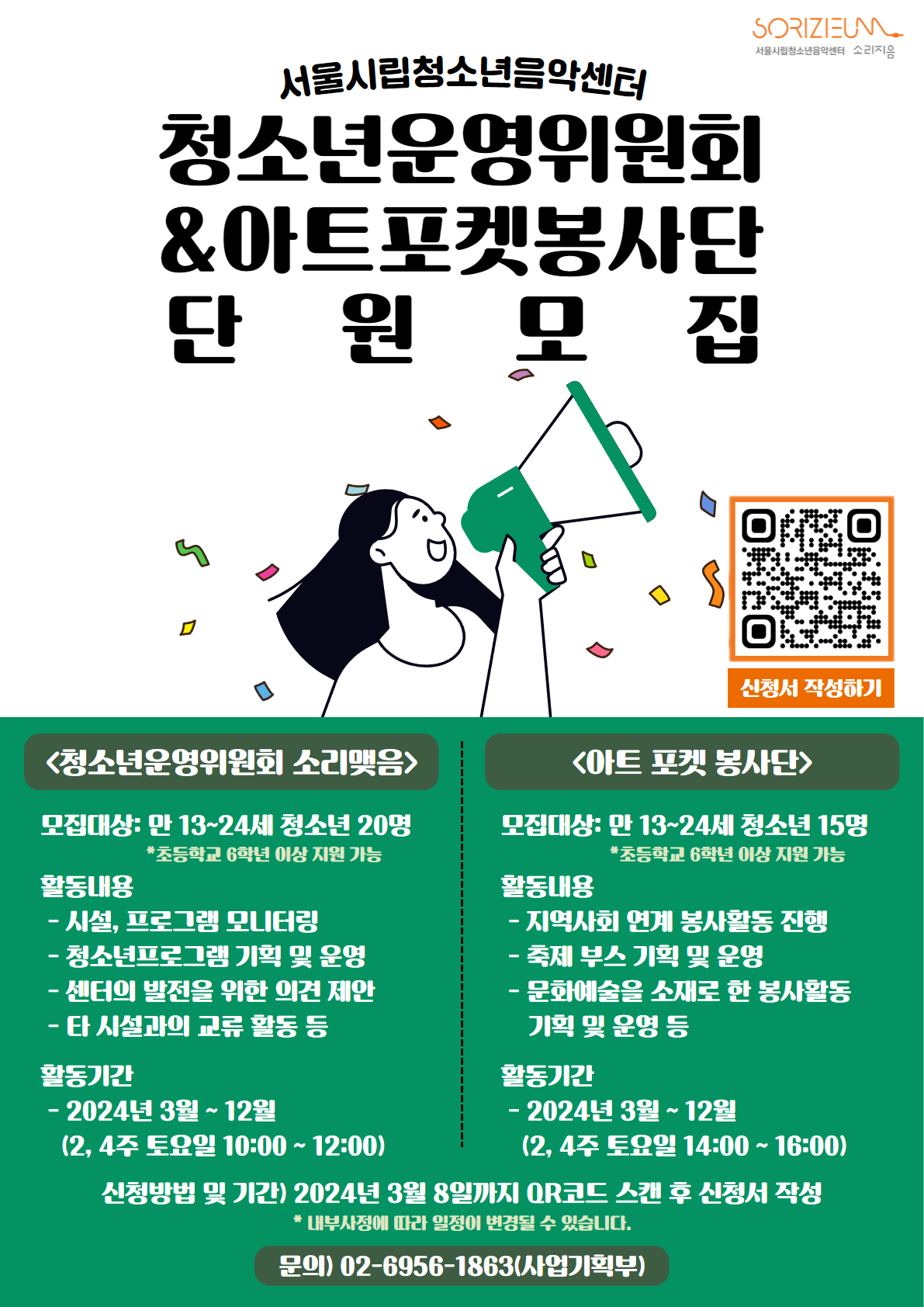 전국 유일 청소년 음악 특화시설 서울시립청소년음악센터에서 2024년 청소년운영위원회와 아트 포켓 봉사단의 단원을 모집합니다✨