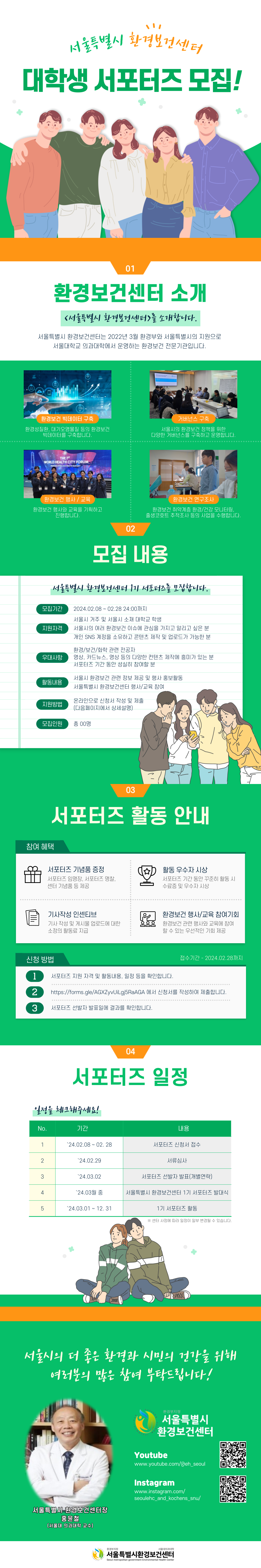 서울특별시 환경보건센터는 2022년 3월 환경부와 서울특별시의 지원으로 서울대학교 의과대학에서 운영하는 환경보건 전문기관입니다. 2024년 센터의 미래를 함께할 1기 서포터즈를 모집하니 많은 관심과 지원 부탁드립니다.