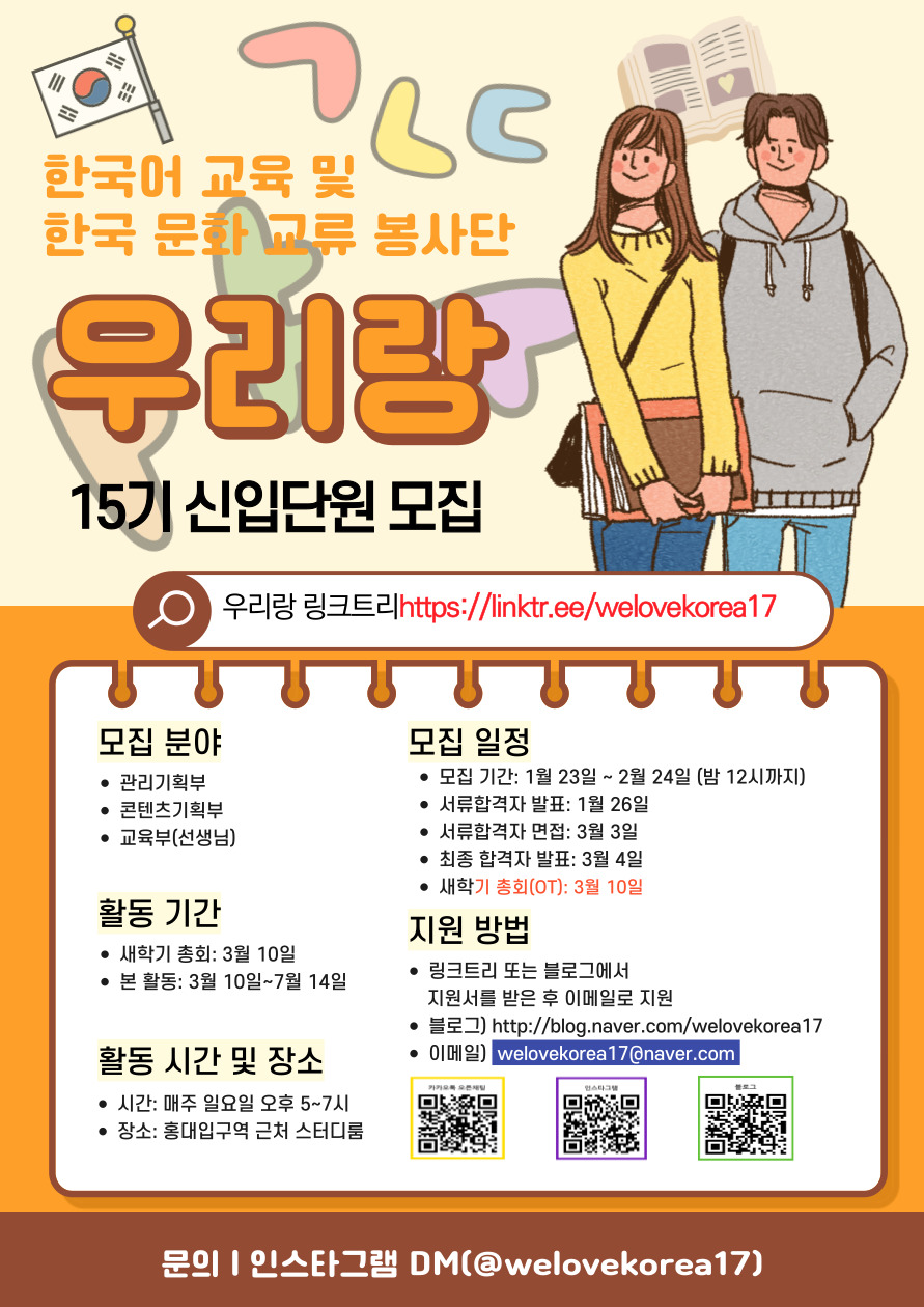 한국어 교육 및 한국 문화 교류 봉사단 우리랑 15기 단원 모집