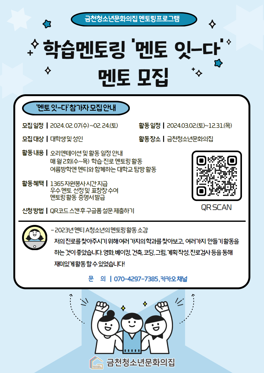 금천청소년문화의집에서 청소년을 대상으로 학습 및 진로 멘토링을 함께 할 멘토를 모집합니다.📗📘🏫