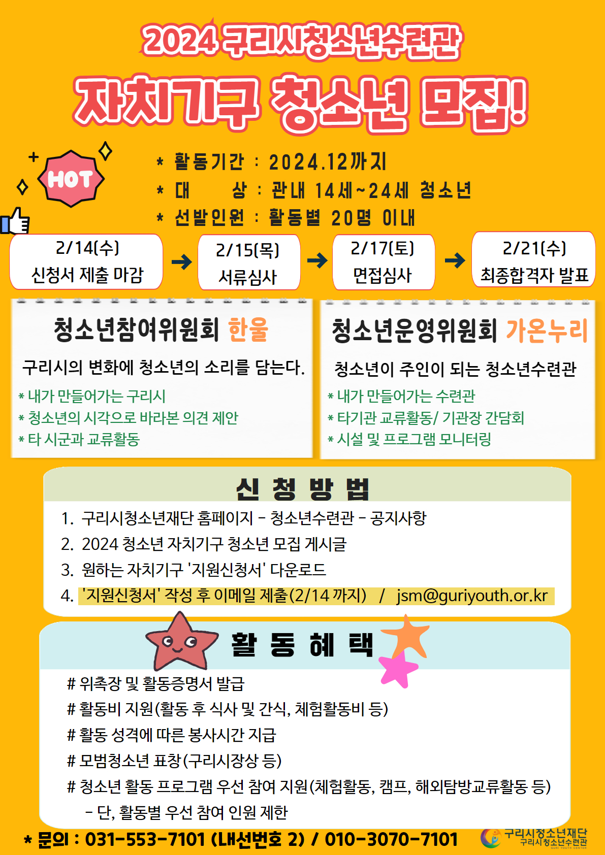 구리시청소년재단 청소년수련관에서는 2024년도 청소년 자치기구를 이끌어갈 신규위원을 모집하고 있습니다.많은 관심과 참여 바랍니다.