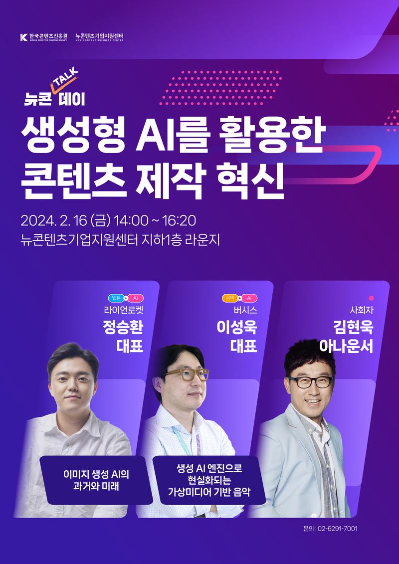 뉴콘텐츠기업지원센터에서 '생성형 AI를 활용한 콘텐츠 제작 혁신'을 주제로 공개 강연을 진행합니다!
