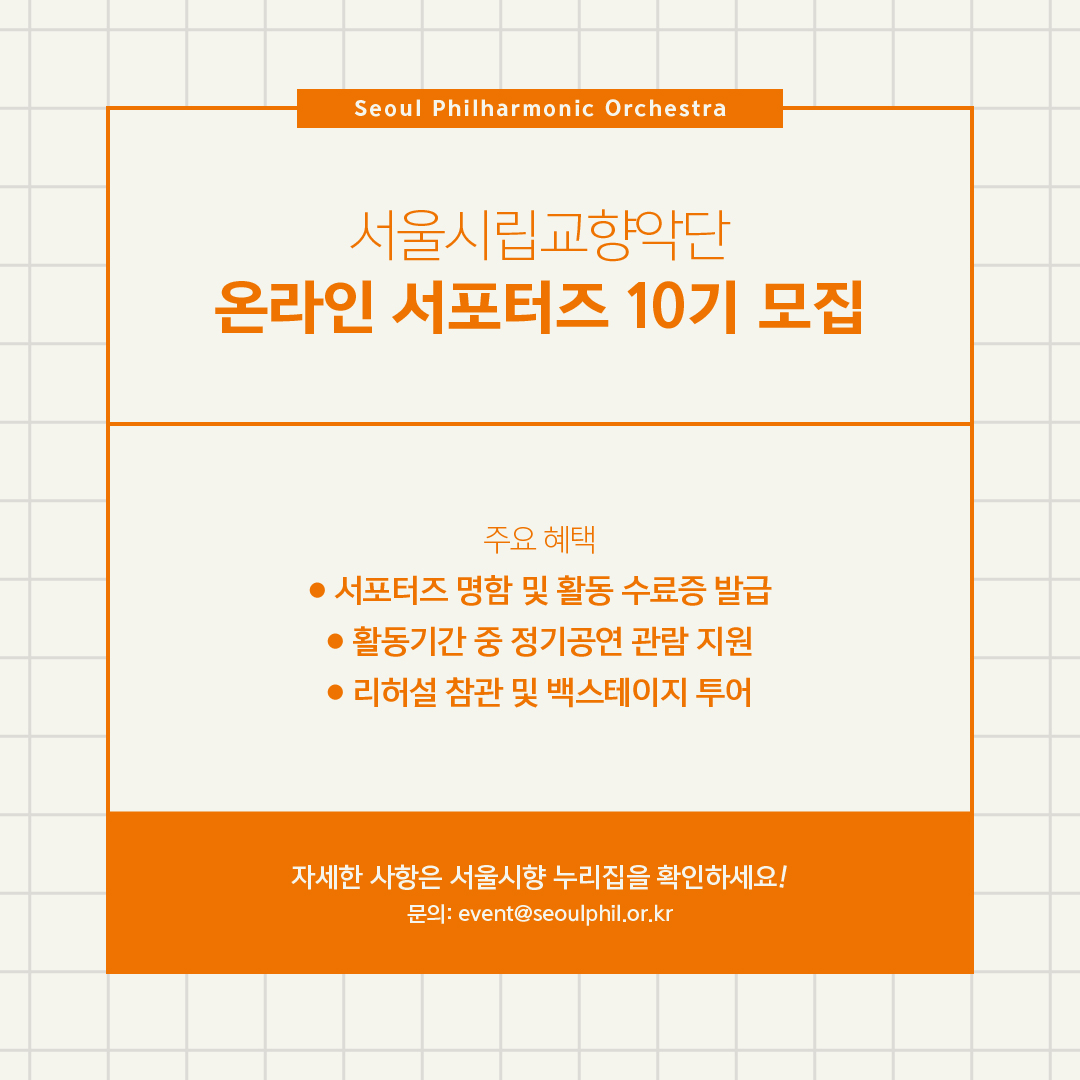 서울시향의 공연 소식과 목소리를 널리 전달해 줄 ‘서울시향 온라인 서포터즈 10기’를 모집합니다.