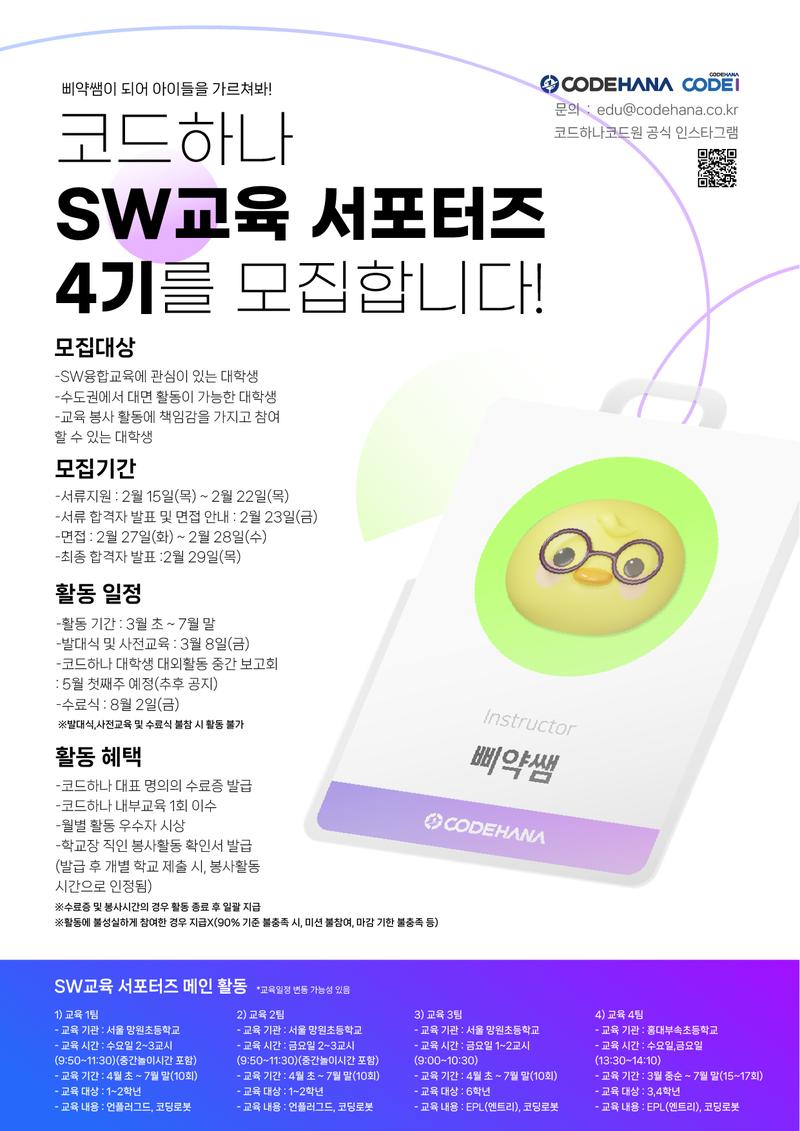 (주)코드하나에서 SW서포터즈 코드하나 코드원 4기를 모집합니다.