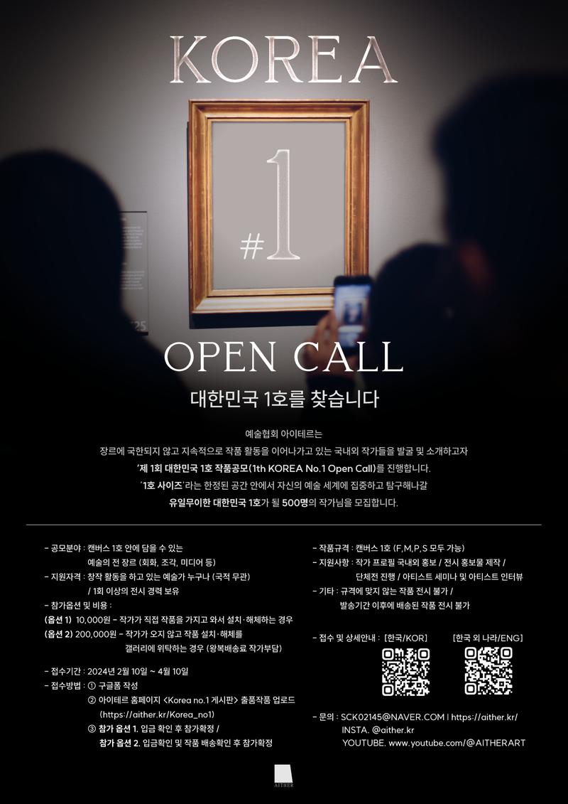 예술협회 아이테르는 장르에 국한되지 않고 지속적으로 작품 활동을 이어나가고 있는 국내외 작가들을 발굴 및 소개하고자 ‘제 1회 대한민국 1호 작품공모(1th KOREA No.1 Open Call)’ 를 진행합니다.