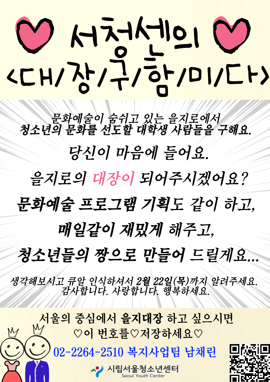 안녕하세요 서울의 중심부에 위치한 시립서울청소년센터에서 최강 자치단이 될 문화예술 기획단 “을지대장”을 찾습니다