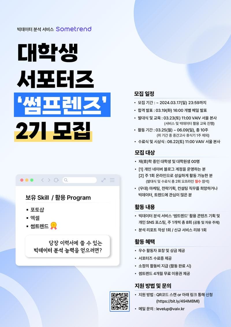 바이브컴퍼니(구 다음소프트)에서 빅데이터 분석 서비스 썸트렌드 대학생 서포터즈 ‘썸프렌즈 2기'를 모집합니다. '누구나 빅데이터 분석을 쉽게 하여 더 나은 선택을 하는 세상'을 만들기 위한 썸프렌즈 활동에 많은 관심과 참여 부탁드립니다!