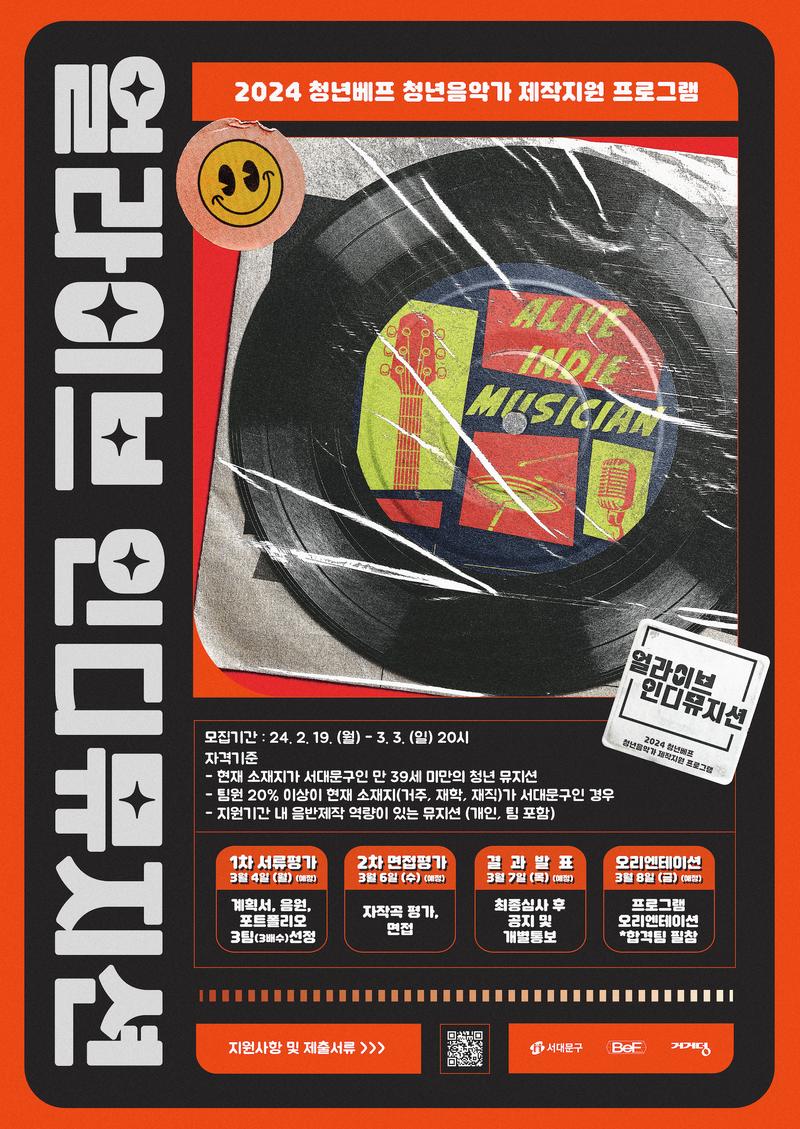 2024 청년베프 청년음악가 제작지원 프로그램 <얼라이브 인디뮤지션> 참가 뮤지션을 모집합니다!