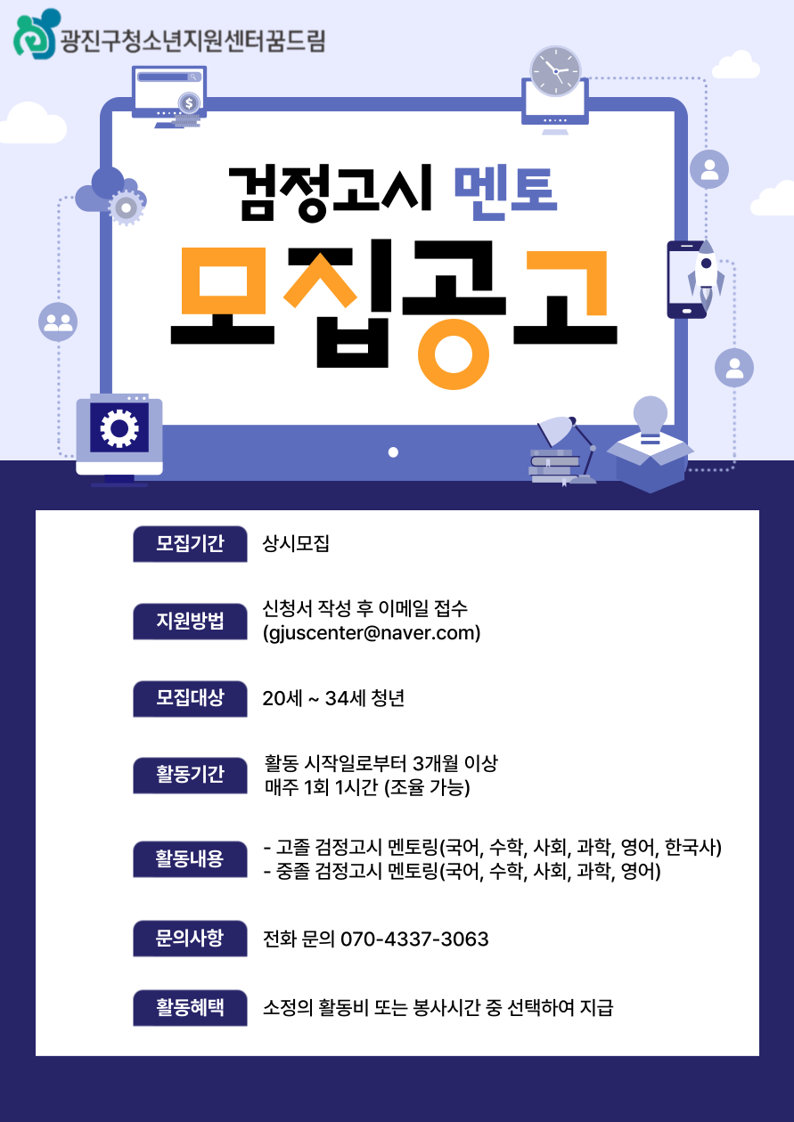 - 고졸 검정고시 멘토링(국어, 수학, 사회, 과학, 영어, 한국사 중 1개 이상 선택)