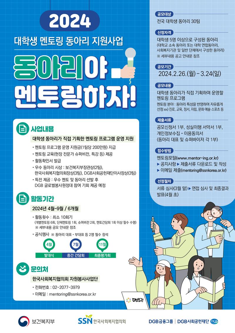 대학생 멘토들이 직접 프로그램을 기획하고 운영하면서 역량을 발휘할 수 있는 기회가 될 수 있는 <2024 동아리야, 멘토링하자!> 많은 관심과 참여 부탁드립니다.
