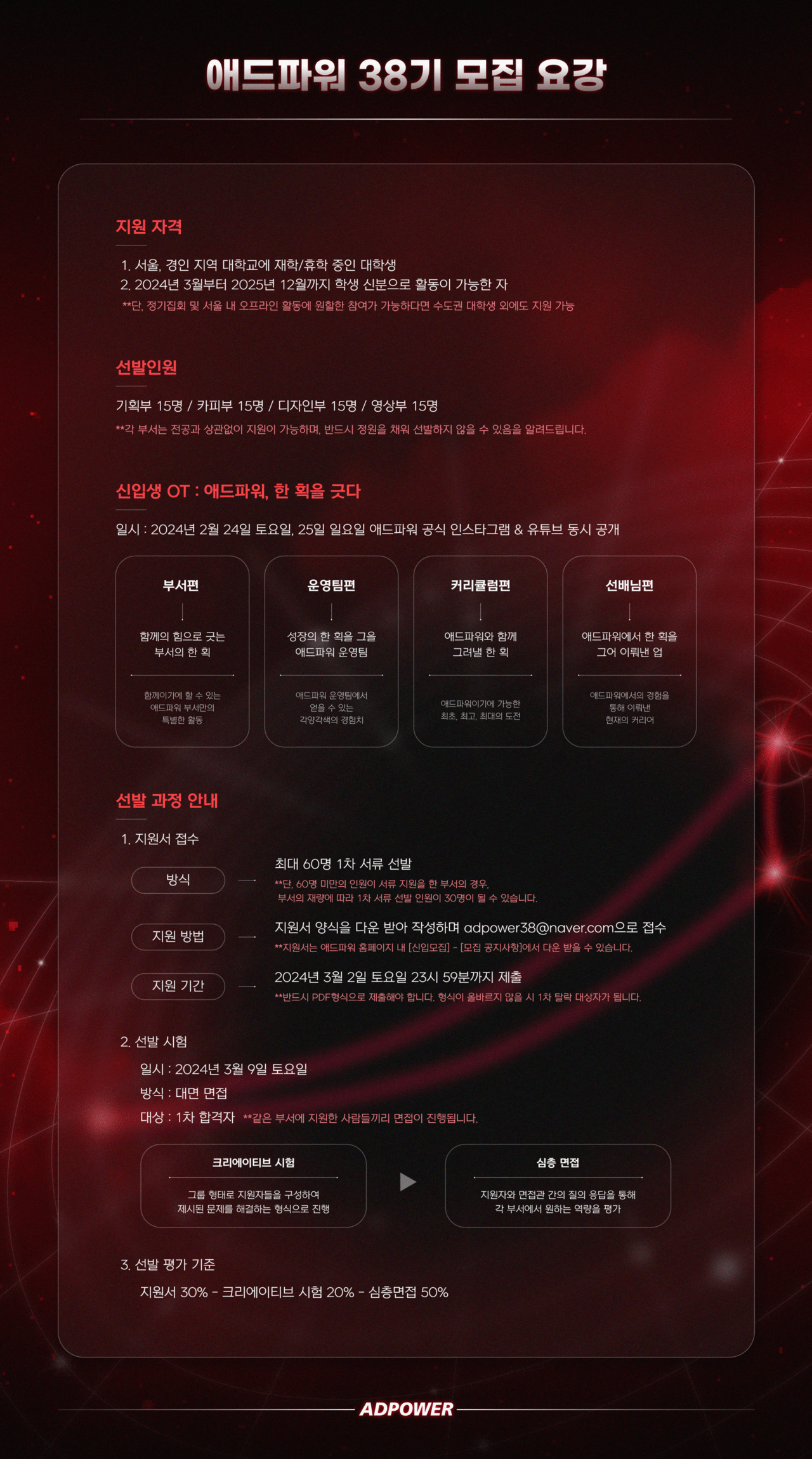 - 신입생 OT 영상 : 2/24(토), 2/25(일) 오후 6시 애드파워 공식 인스타그램, 유튜브 동시 공개
