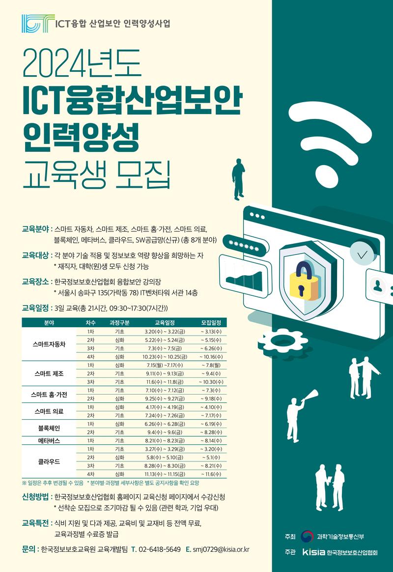 2024년 ICT융합산업보안 인력양성사업 교육생을 모집합니다. (~11월 까지, 모집일정 상이)