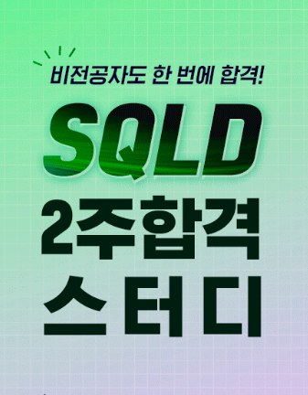 🎁 꽉꽉 눌러 담은 SQLD 스터디 구성 1. 'SQL 전문가 가이드(2020 개정판)' 공동 집필 저자의 SQLD 강의 평생소장 (~3/7까지만 할인) 2. 연습문제 PDF 파일 3. 2주 스터디 플랜 4. 4주 스터디 플랜 5. Q&A 라이브 특강 6. Q&A 커뮤니티 7. 데일리 학습 관리