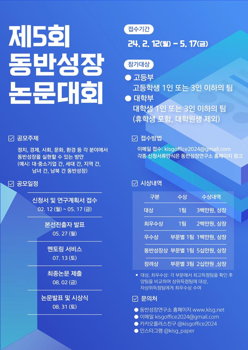 5회째를 맞이하는 동반성장 논문대회는 고등학생과 대학생을 대상으로 하며, 앞으로 우리 사회를 이끌어갈 인재들에게 동반성장에 대해 깊이 생각해 볼 기회를 제공하고, 동반성장 문화의 조성과 확산을 통해 따뜻하고 공정한 사회를 만드는데 기여하고자 개최하는 소논문 대회입니다. 뜻있는 젊은 인재들의 적극적인 도전을 기대합니다.