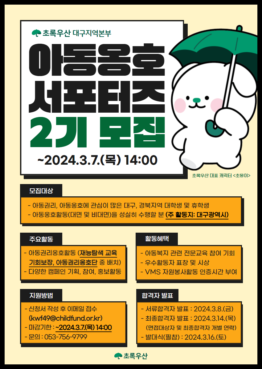 - NGO 대외활동의 꽃! 초록우산 대구지역본부에서 아동옹호서포터즈를 모집합니다!