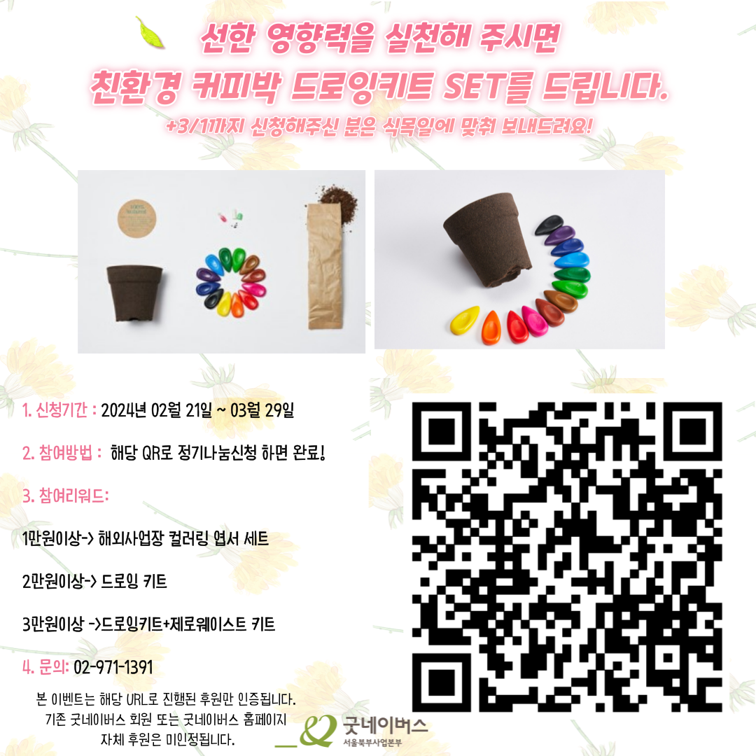 -해당 QR코드 및 URL로 정기나눔 신청 -> 드로잉키트 수령( 발송 전 개별연락 예정) -> https://www.goodneighbors.kr/common/module/slideShare.jsp?campaignCode=FA2024022727