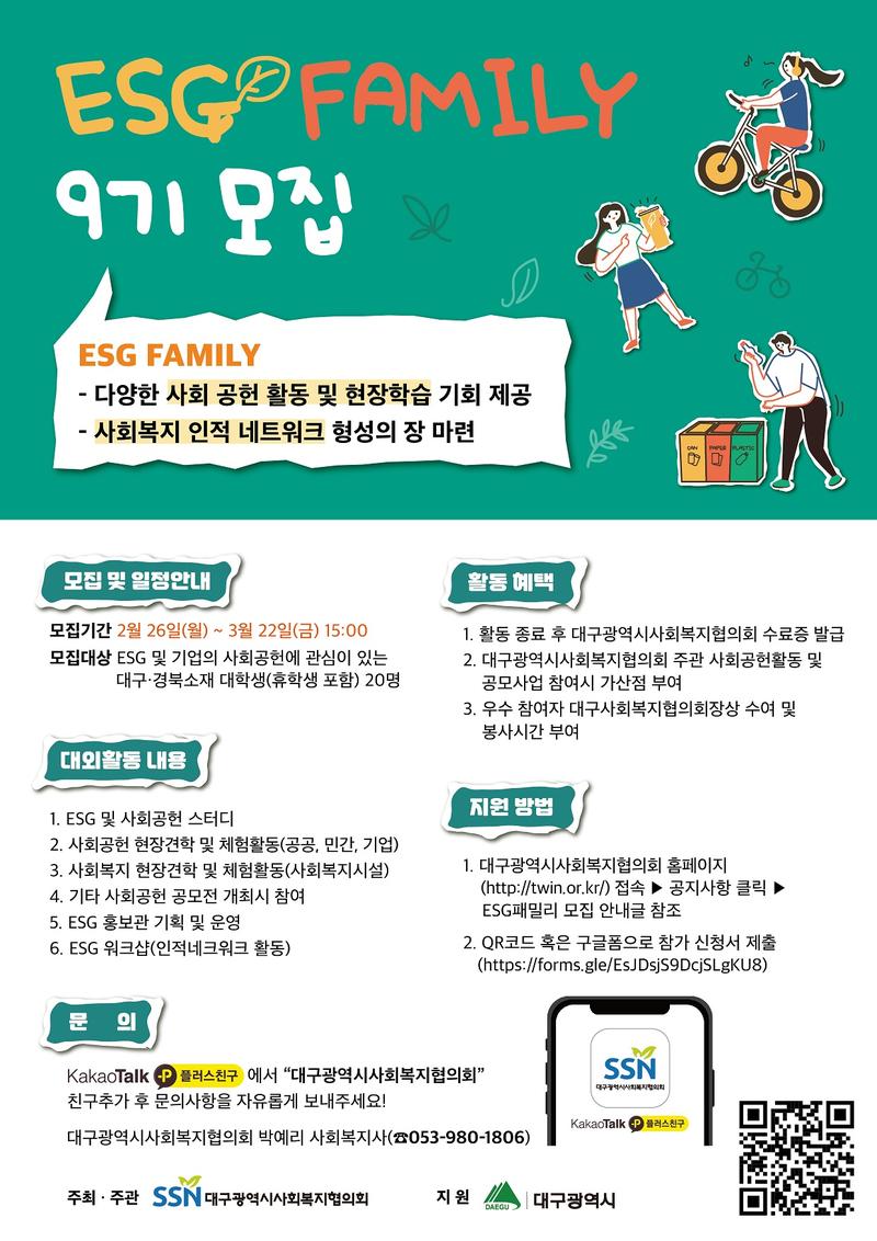 안녕하십니까? 대구광역시사회복지협의회 사회공헌정보센터 입니다. 2024년 'ESG패밀리' 모집 안내를 드리며, 많은 대학생 여러분들의 관심과 참여를 부탁드립니다 : )