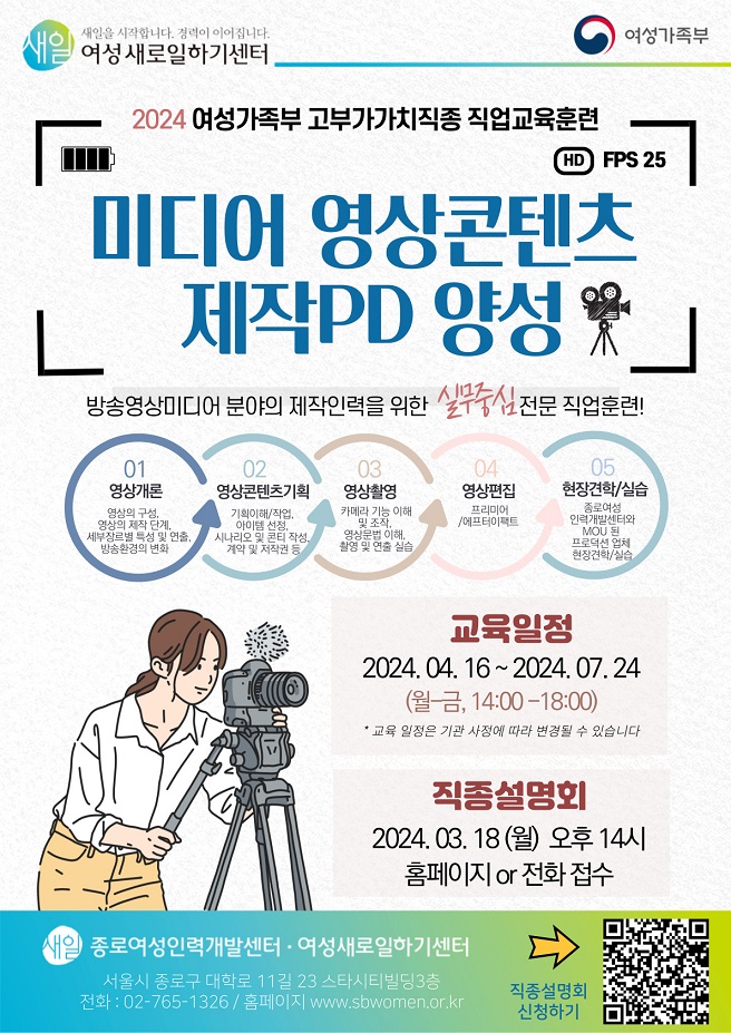 ○ 접수방법 : 종로여성인력개발센터 커뮤니티 ▶ 공지사항 ▶ [국비지원] 미디어영상콘텐츠 제작PD 신청서 양식 다운로드 ▶ [제출서류]와 함께 이메일 송부(jongno@seoulwomanup.or.kr)
