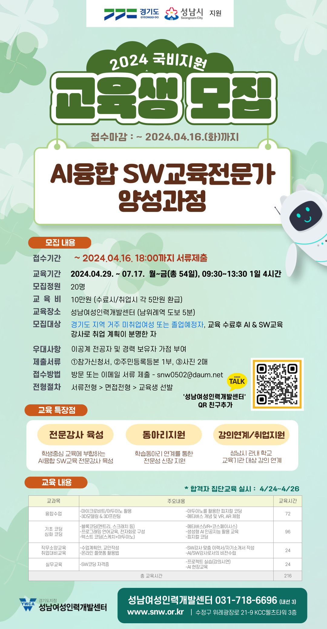 ○ 접수문의 : 성남여성인력개발센터 031-718-6696(내선3) / 홈페이지 http://www.snw.or.kr