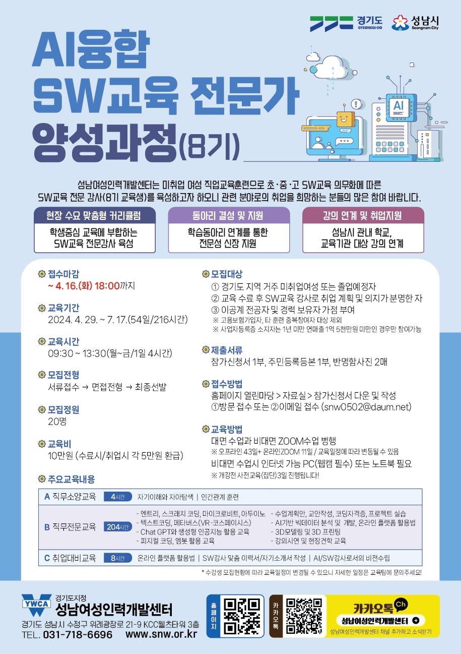 성남여성인력개발센터에서 2024년 상반기 국비지원 교육생을 모집합니다.
