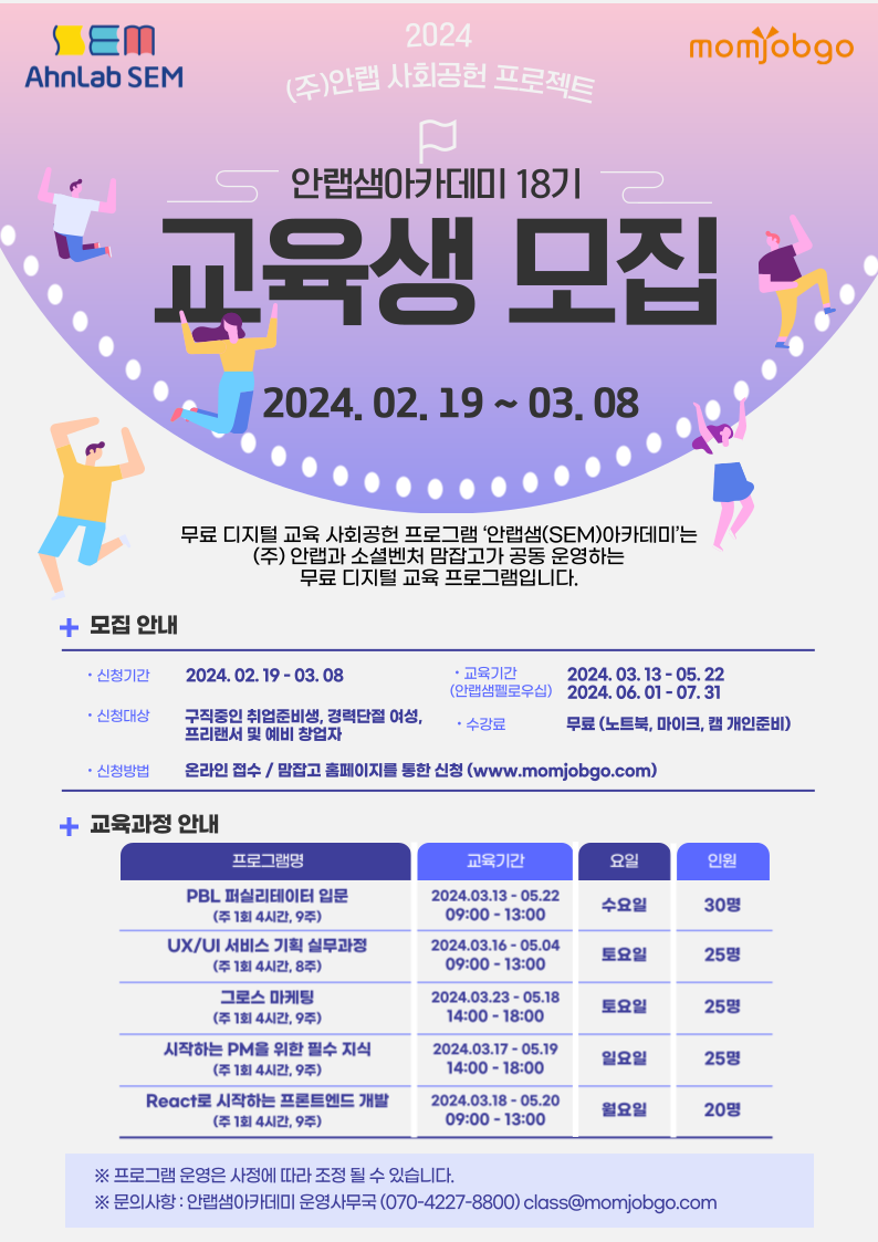 안랩샘아카데미 18기 교육생 모집 (~3/8) (momjobgo.com)