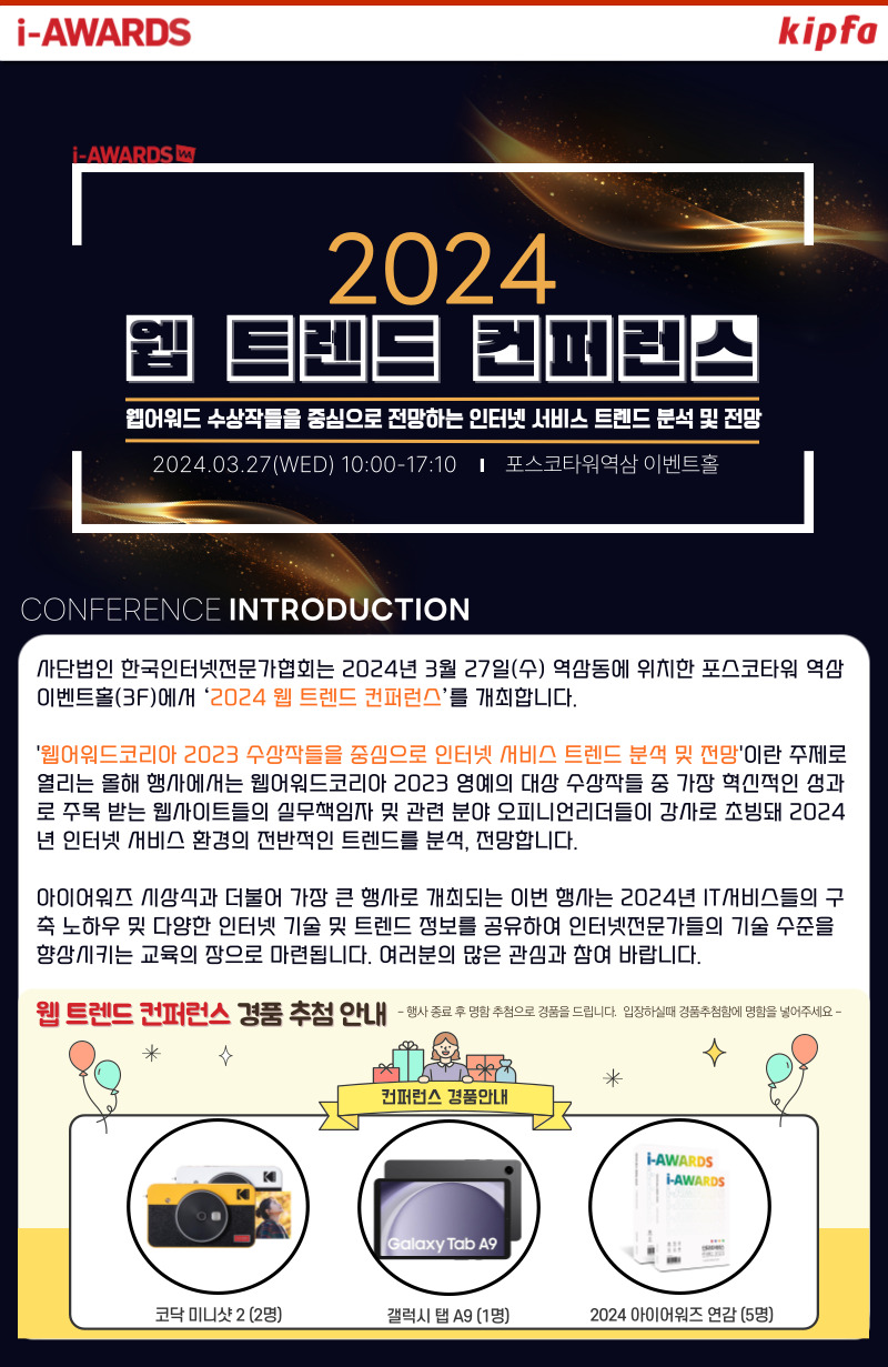 (사)한국인터넷전문가협회(협회장, 민승재)는 ‘웹어워드코리아 2023 수상작들을 중심으로 인터넷서비스 트렌드 분석 및 전망’이란 주제로 오는 3월 27일(수) 포스코타워역삼 이벤트홀에서 『2024 웹 트렌드 컨퍼런스』를 개최한다.
