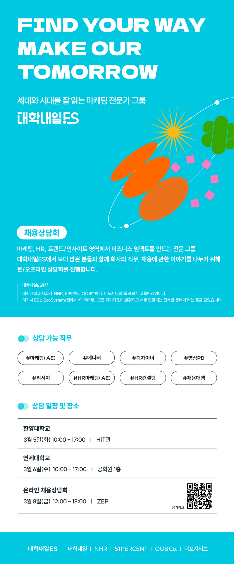 대학내일ES에서 더 많은 분들과 채용, 직무에 대한 이야기를 나누고자채용 상담회를 진행하오니 많은 관심 부탁드립니다! :) 오프라인 상담회의 경우 타대생도 가능하며, 별도 신청 없이 현장 대기해주시면 됩니다.온라인 상담회의 경우 하단 참가링크 QR코드를 통해 신청 부탁드리겠습니다.