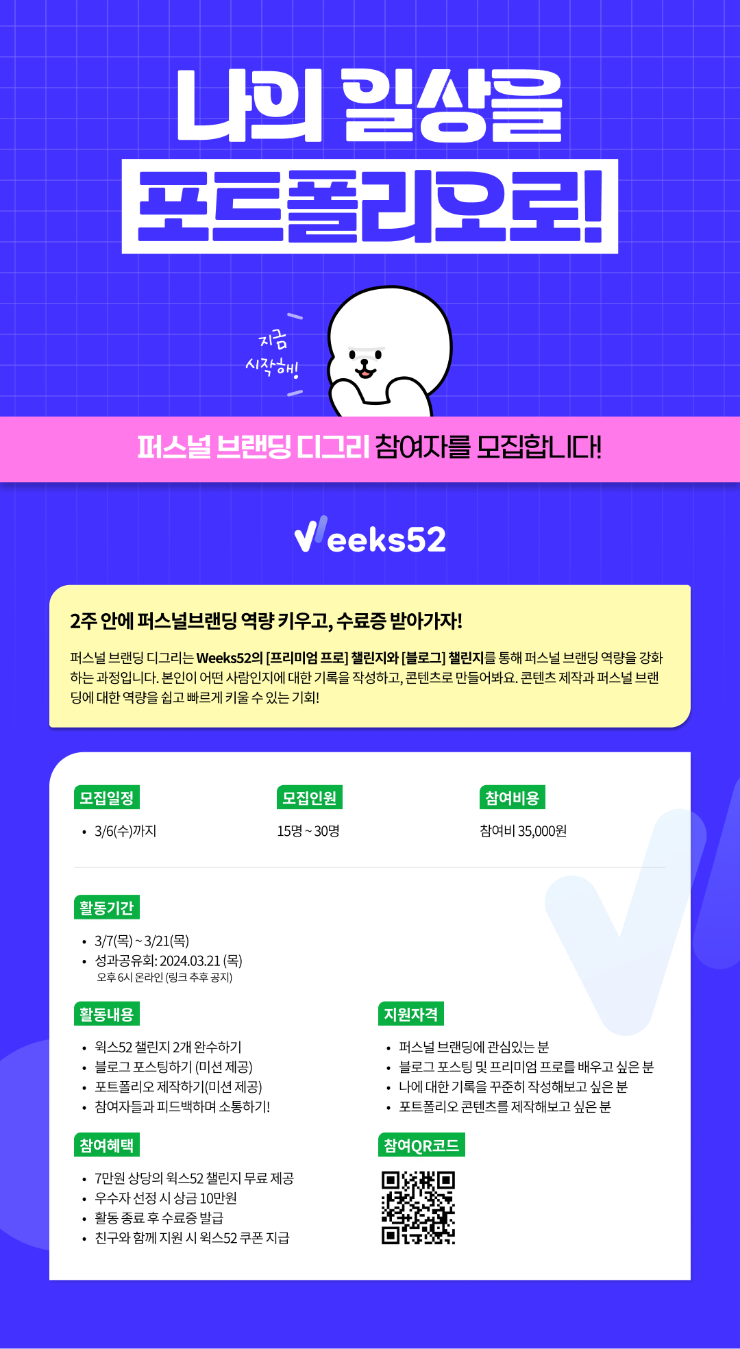- 퍼스널 브랜딩 디그리는 Weeks52의 [프리미엄 프로] 챌린지와 [블로그] 챌린지를 통해 퍼스널 브랜딩 역량을 강화하는 과정입니다.