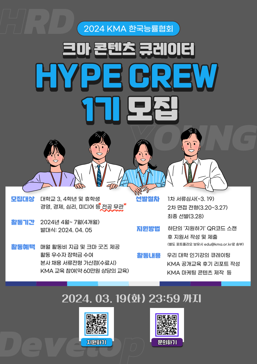 기업 교육 대표기관 KMA 한국능률협회에서 크마(KMA) 콘텐츠 큐레이터 HYPE CREW 1기로 활동하실 분들을 모집합니다. HYPE 크루는 HRD · YOUNG · DEVELOP 이라는 키워드를 담고 있는 콘텐츠 큐레이터입니다. Z세대 대학생 여러분의 시선으로 KMA와 HRD 산업 이슈를 분석하고, 대학의 유명 강사/과정을 발굴, 기업 홍보 및 마케팅 등의 활동을 통해 미래 HRDer 혹은 마케터를 꿈꾸는 분들에게 역량 개발의 기회를 제공합니다.
