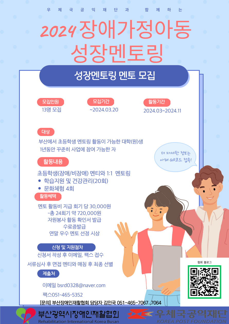 - 우체국 공익재단의 지원을 받아 시행되는 장애가정아동 성장멘토링입니다