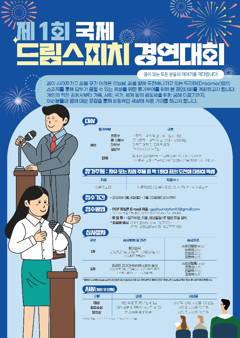 - 꿈이 사라져가고 꿈을 꾸기 어려운 오늘날, 꿈을 향해 도전해나가고 있는 드리머(Dreamer)들의 스피치를 통해 모두가 꿈꿍 수 있는 세상을 위한 동기부여를 위해 본 경연대회를 개최하고자 합니다. 개인의 작은 꿈에서부터 가족, 사회, 국가, 세계 등의 공동체를 위한 꿈에 이르기까지, 여러분들의 꿈에 대한 공감을 통해 희망적인 세상에 작은 기여를 하고자 합니다.