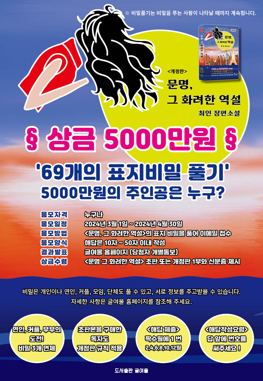 《문명, 그 화려한 역설》을 읽고 표지에 숨겨진 69개의 비밀을 풀어 이메일로 제출합니다.