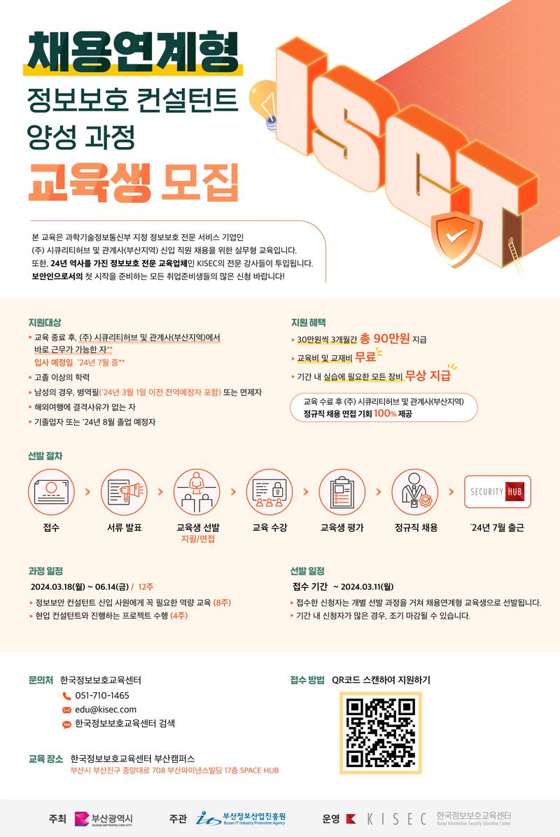 ⊙ 교육 수료 후 (주)시큐리티허브 및 관계사 (부산지역) 정규직 채용 면접 기회 100% 제공!