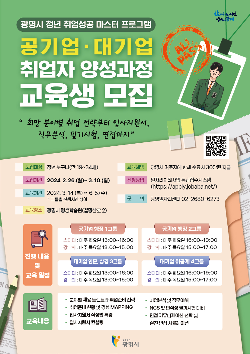 [광명시] 취업 스터디, 밀착 교육 병행 '청년 취업 성공 마스터 프로그램' (공기업, 대기업 취업자 양성과정) - 대면 참여자 모집 (~3/10)