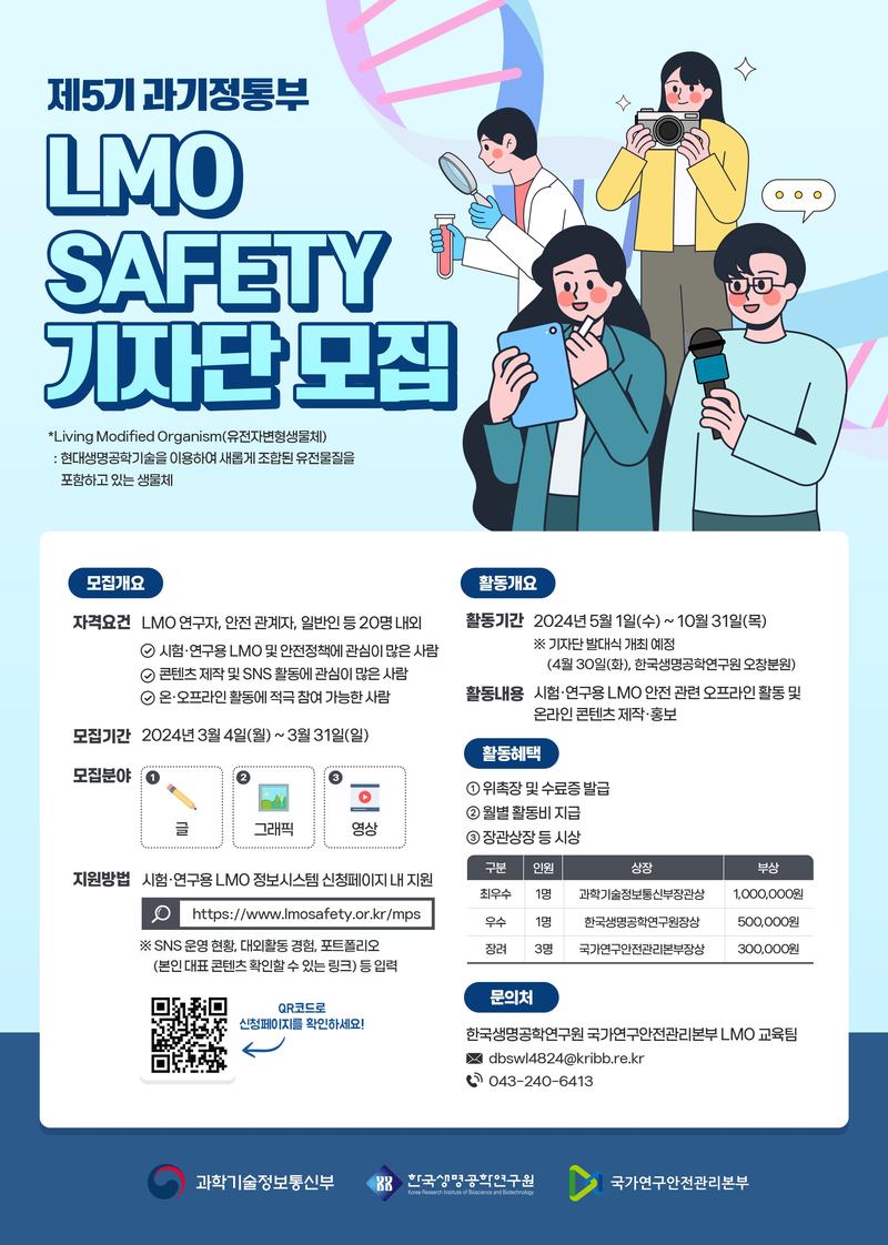 시험‧연구용 유전자변형생물체(LMO) 안전 관련 올바른 정보 전달 및 안전문화 확산을 위한 「제5기 과기정통부 LMO SAFETY 기자단」을 모집하오니 많은 관심과 참여 바랍니다