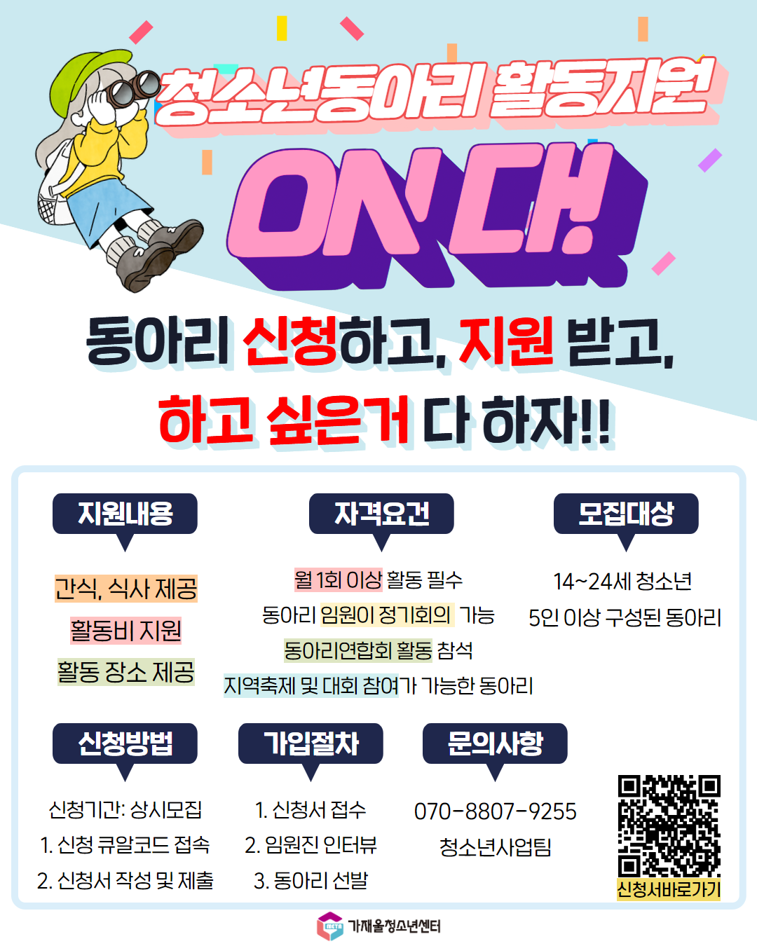 · 모집대상: 중등 1학년 ~ 대학 4학년 (청소년 5인 이상 구성된 동아리)