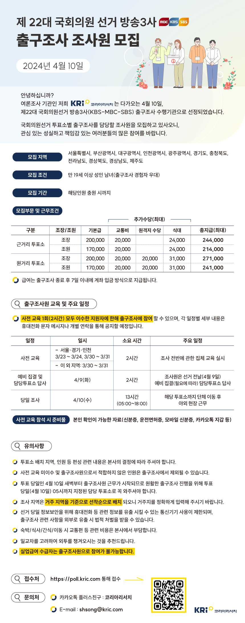 - 출구조사(조장, 조사원) : 2024년 4월 10일(수) 05:00~18:00