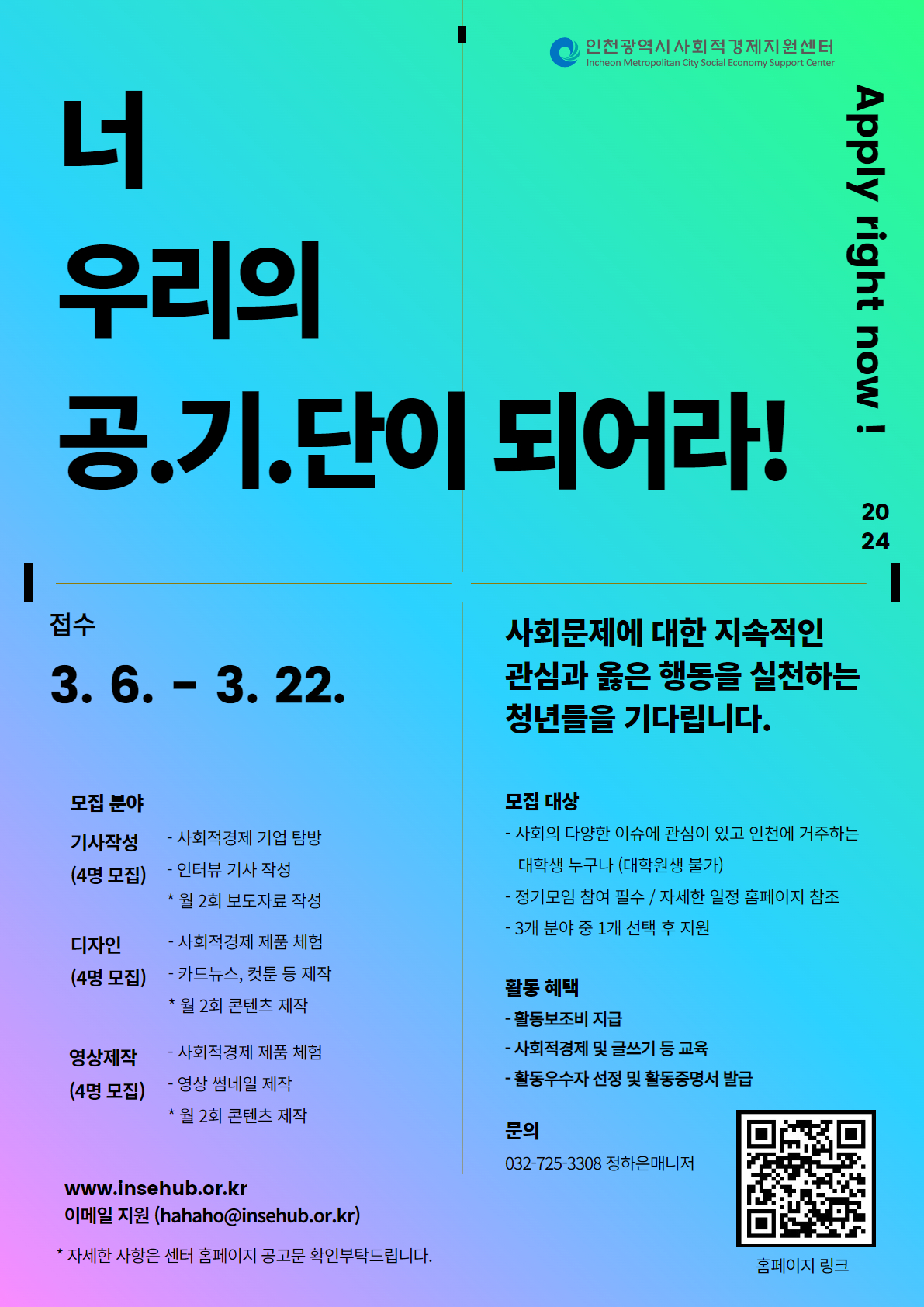 인천광역시사회적경제지원센터는 사회적경제의 지속적인 성장을 위한 차세대 리더 육성을 위해 적극적이고 창의적인 청년들을 모시고자 아래와 같이 공고하오니 많은 관심과 지원 바랍니다.