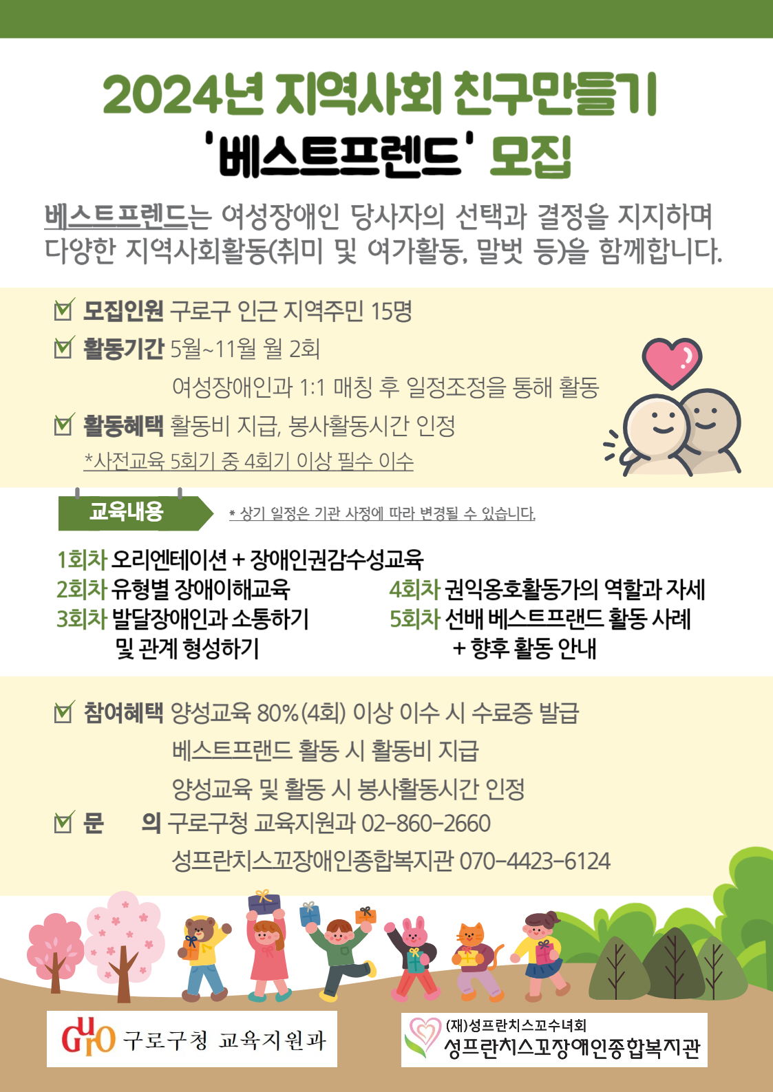 지역사회 친구만들기 '베스트프렌드' 봉사자를 모집하오니 많은 관심 부탁드립니다.