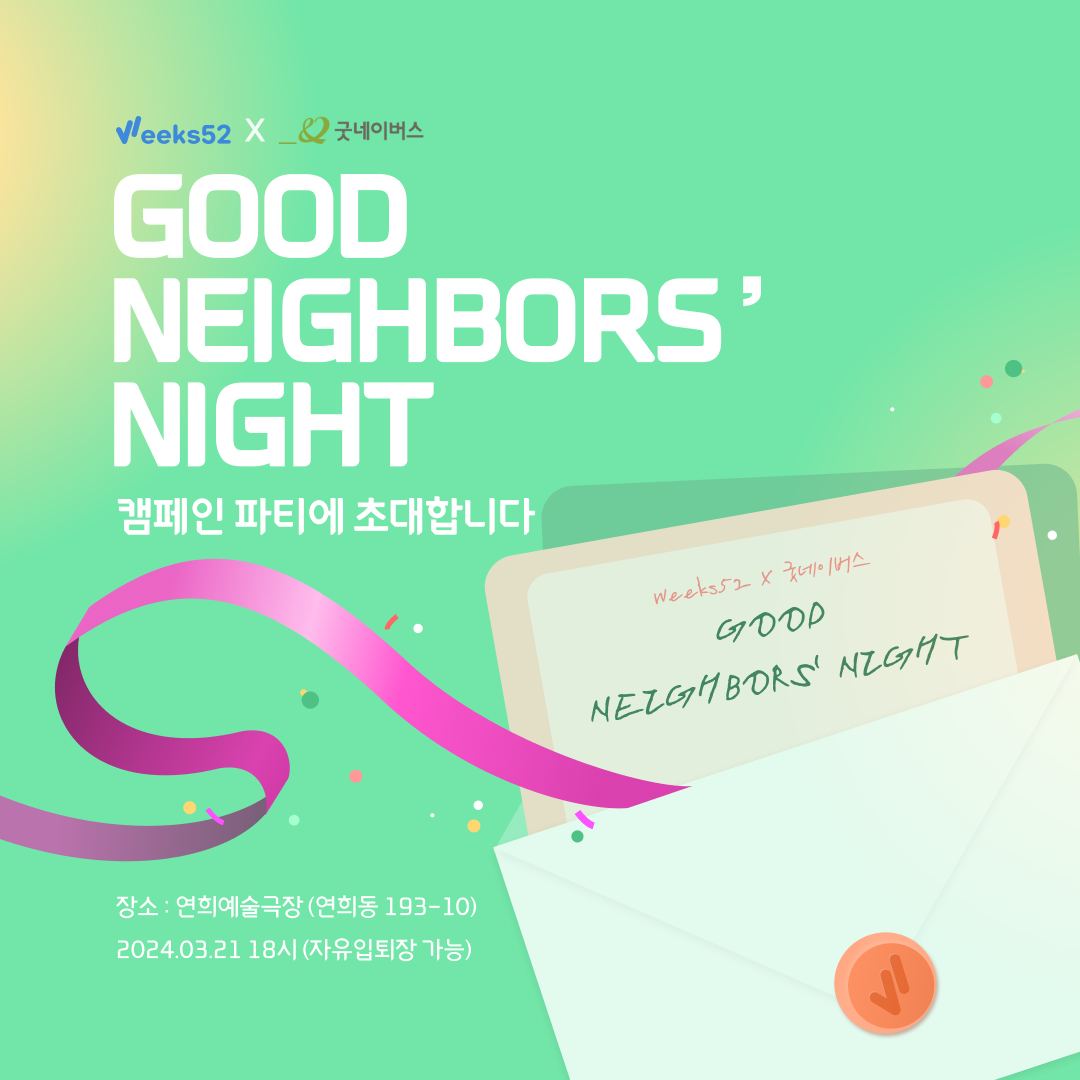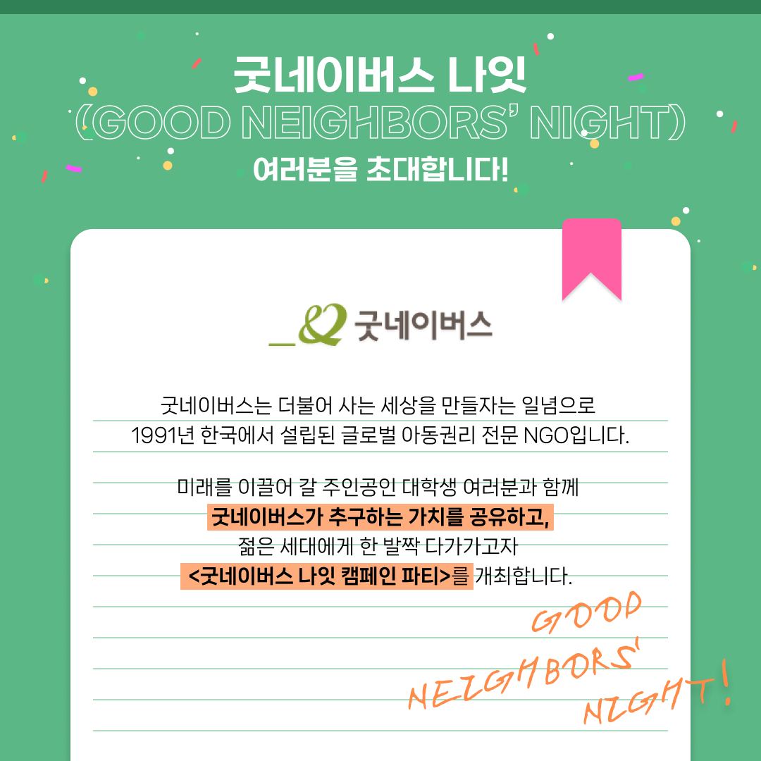 대학생 여러분과 함께하는 이 특별한 파티에서는 굿네이버스가 추구하는 가치를 공유하고, 젊은 세대에게 한 발자국 더 가까이 다가가고자 합니다.