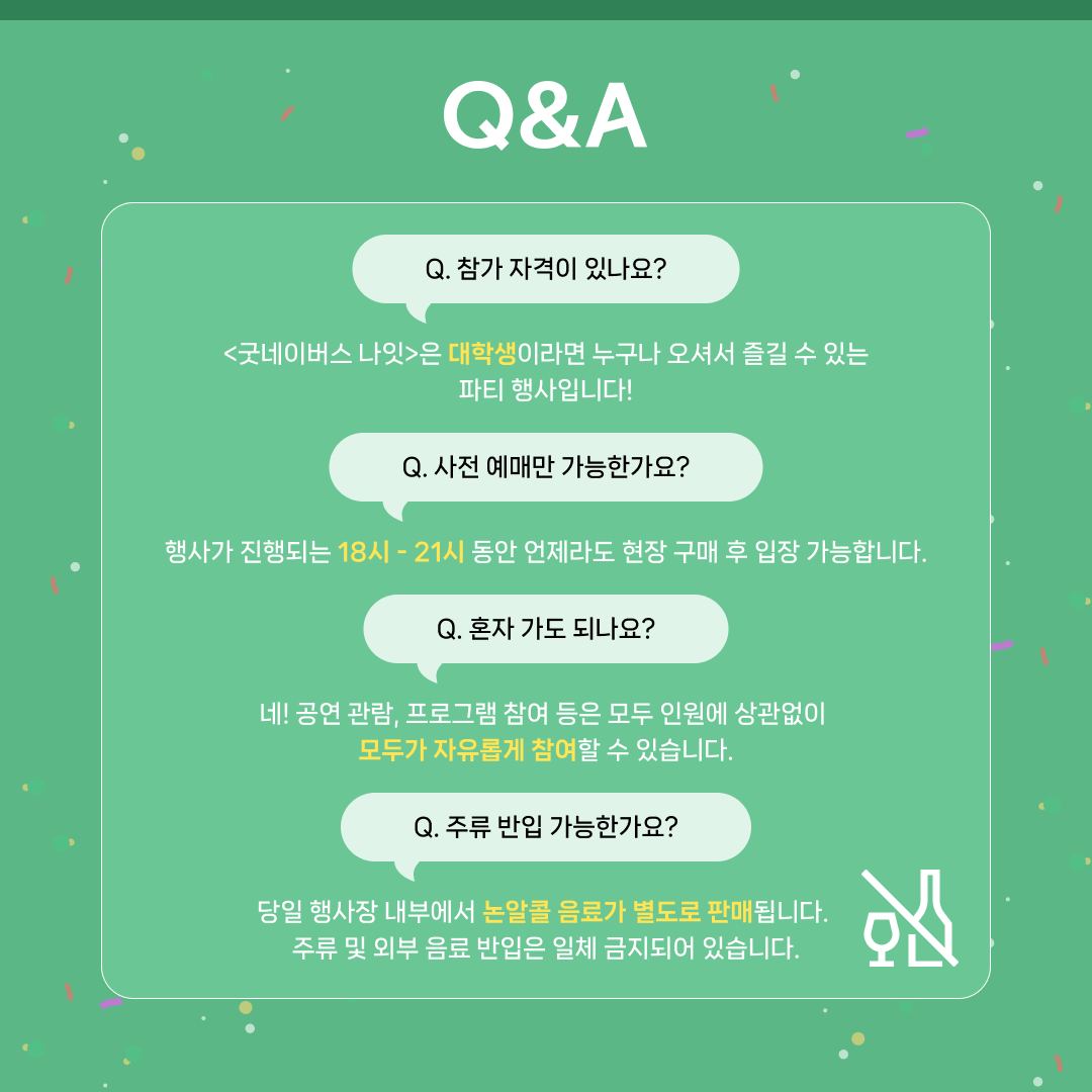 다양한 공연과 무료 치킨 시식 이벤트까지 대학생 여러분을 위한 파티가 준비되어 있습니다. 굿네이버스와 함께 특별한 추억을 만들어가시길 바랍니다. 많은 참여 부탁드립니다! 🌟