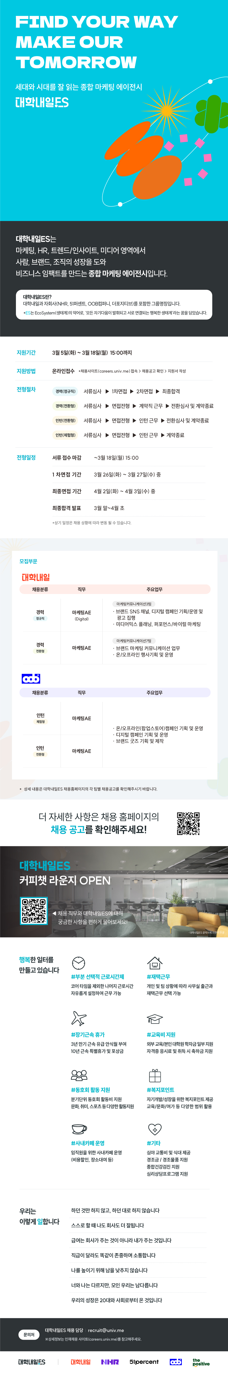 ✅ 대학내일ES 인턴 프로그램을 소개합니다! 👉 (링크)✅ 잡플래닛 선정 일하기 좋은 광고회사 TOP2 대학내일 입사 1년차 AE의 취뽀 비결은? 👉 (링크)✅ 대학내일ES의 2023년 쇼릴이 궁금하다면? 👉 (링크)✅ 대학내일ES 온/오프라인 채용 상담회 참여하기 👉 (링크)
